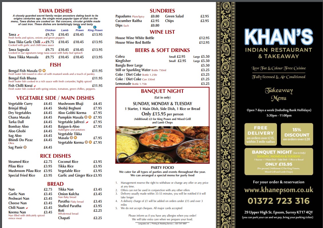 As a reviewer looking back over the menu at Khans Epsom, located at 29 Upper High St, Epsom KT17 4QY, United Kingdom, the overall impression is one of balance, depth, and confidence in classic Indian flavors. The recommended dishes highlight the kitchen’s strengths in working with rich spices, layered sauces, and well-prepared proteins. Dishes like MURGH JALFRAZI stand out for their bold, vibrant character, offering a satisfying combination of tender chicken and aromatic spices that feels both comforting and lively. HARIYALI MASSALA brings a contrasting freshness to the menu, with its green herb-based sauce adding a fragrant, earthy note that showcases a more delicate side of Indian cooking. For those who enjoy a creamier, crowd-pleasing option, MURGH TIKKA MASALA delivers exactly what is expected: smooth, well-rounded flavors and a sauce that feels indulgent without being overwhelming. Seafood lovers are not overlooked, as JHINGA CHANGEZI provides a richer, more luxurious experience, pairing prawns with a deeply spiced sauce that reflects careful attention to balance and texture. Completing the selection, MURGH HANDI LAZIZ lives up to its name, offering a slow-cooked, flavorful dish that feels hearty and satisfying, ideal for diners seeking something robust and comforting. Taken together, this menu selection reflects a restaurant that understands its audience and remains consistent in quality and flavor, making Khans Epsom a reliable choice for those looking to enjoy well-executed Indian classics in a welcoming setting.